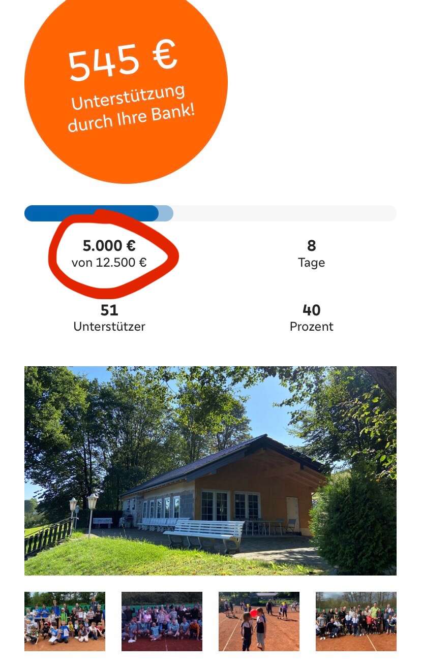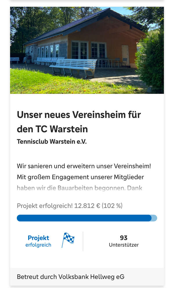 Bisher wurden auf der Crowdfunding Plattform aufgrund eines technischen Fehlers nur 545 € Co-Funding durch die Volksbank Hellweg verbucht. Obergrenze sind aber 1000 €. Die restlichen 455 € sowie weitere 2000 € für unser Clubheim bekommen wir aufgrund unseres tollen Einsatzes im Crowdfunding noch obendrauf!🤩 Insgesamt also eine Unterstützung von 3.000 € durch die Volksbank Hellweg - vielen Dank!😊
