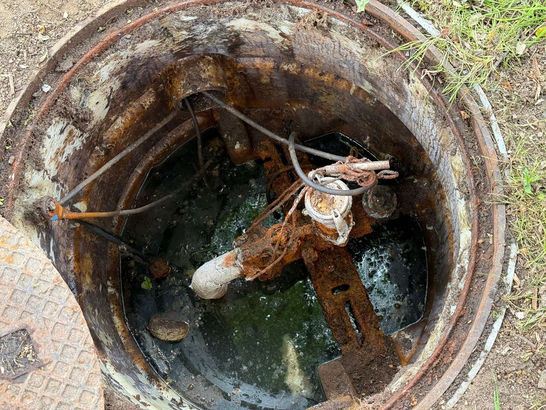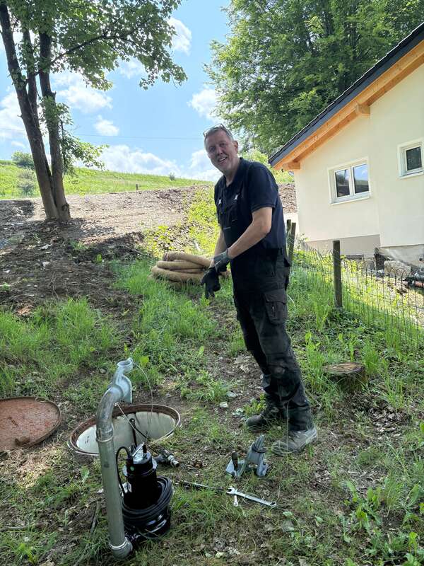 Wir haben noch bis 22:30 Uhr die in einem Außenschacht verbaute Starkstrom-Pumpe mit Hilfe von Fachfirmen im Notdienst zu reparieren versucht, aber die Anlage liegt in ca. 2 Meter Tiefe und dafür muss der Schacht zunächst ausgepumpt und gesäubert werden, um an die defekte ca. 20 Jahre alte Anlage zu kommen.