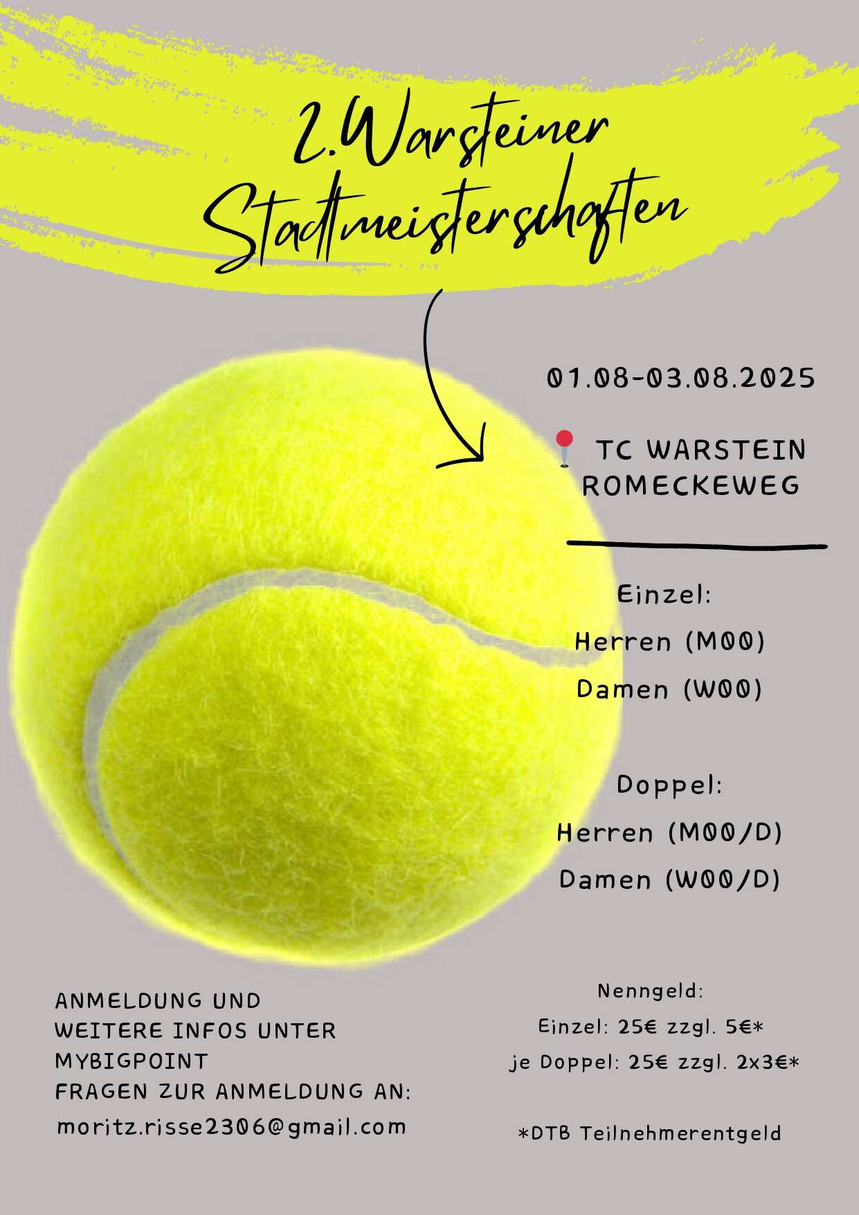 vom 01.08.2025 bis zum 03.08.2025 finden bei uns auf der Anlage die 2. Warsteiner Stadtmeisterschaften in den Konkurrenzen Herren und Damen Einzel sowie Herren und Damen Doppel statt💪🏻. Auch dieses Jahr wieder mit LK-Wertung.
