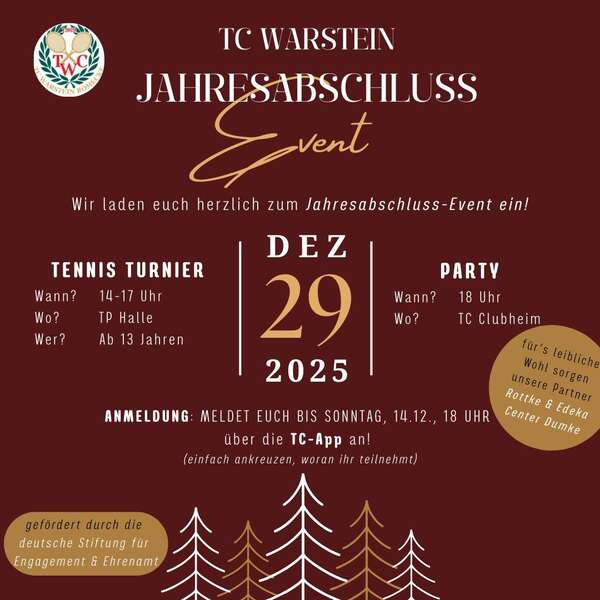 Dazu laden wir euch herzlich am 29.12. zu einem Turnier in die Tennishalle ein. Anschließend laden wir euch ab 18 Uhr zur Jahresabschlussfeier im Clubheim ein. Für euer leibliches Wohl ist bestens gesorgt.
