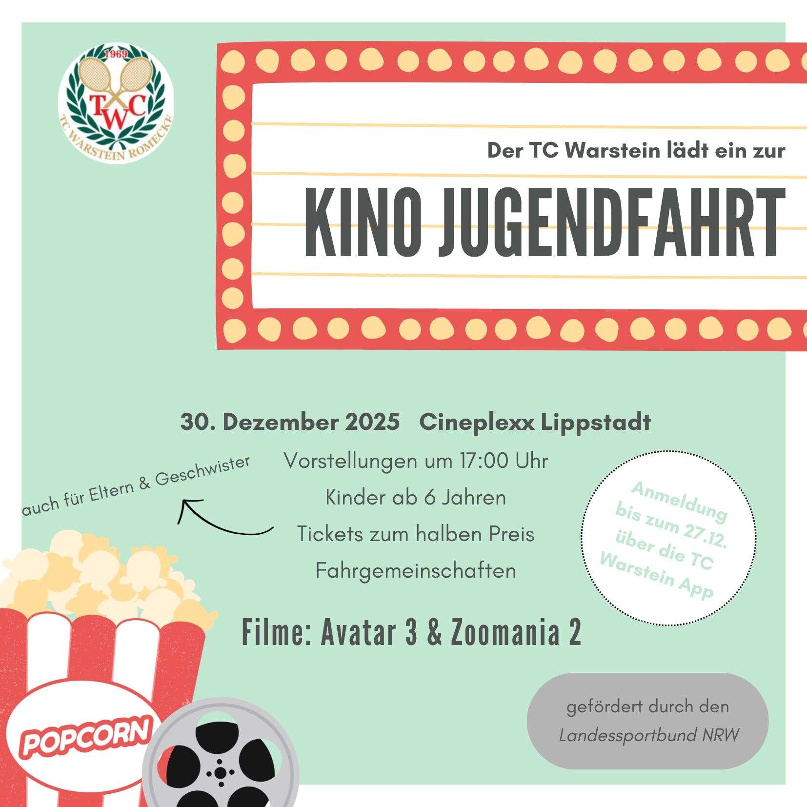 wir freuen uns, euch zum Jahresabschluss zur traditionellen TC Kinofahrt nach Lippstadt ins Cineplex einzuladen. Am 30.12. um 17:00 könnt ihr zwischen Avatar und Zoomania wählen. Bitte beachtet das Mindestalter von 6 Jahren.