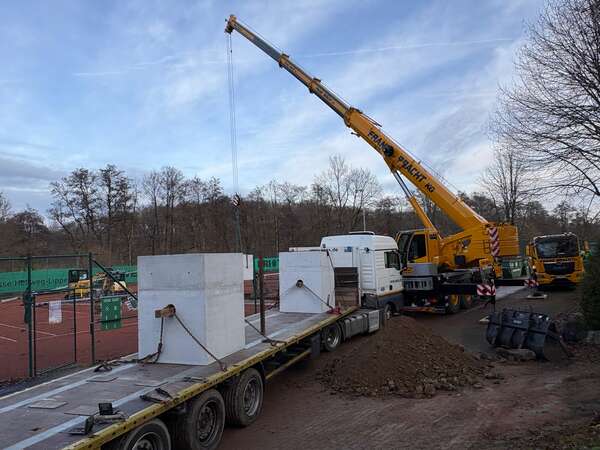 Um diese Arbeiten durchführen zu können, wurden zunächst die Zäune der vier Plätze durch die Fa. Zaunkreisel erneut in großem Ausmaß geöffnet. Zum Schutz der Tennisplätze wurden tonnenschwere Eisen-Drucklastplatten verlegt, damit ein 60 Tonnen Schwerlastkran der Firma Franz Bracht auf die Plätze fahren und die Betonfundamente an den entsprechend ausgehobenen Stellen im Erdreich versenken konnte.
